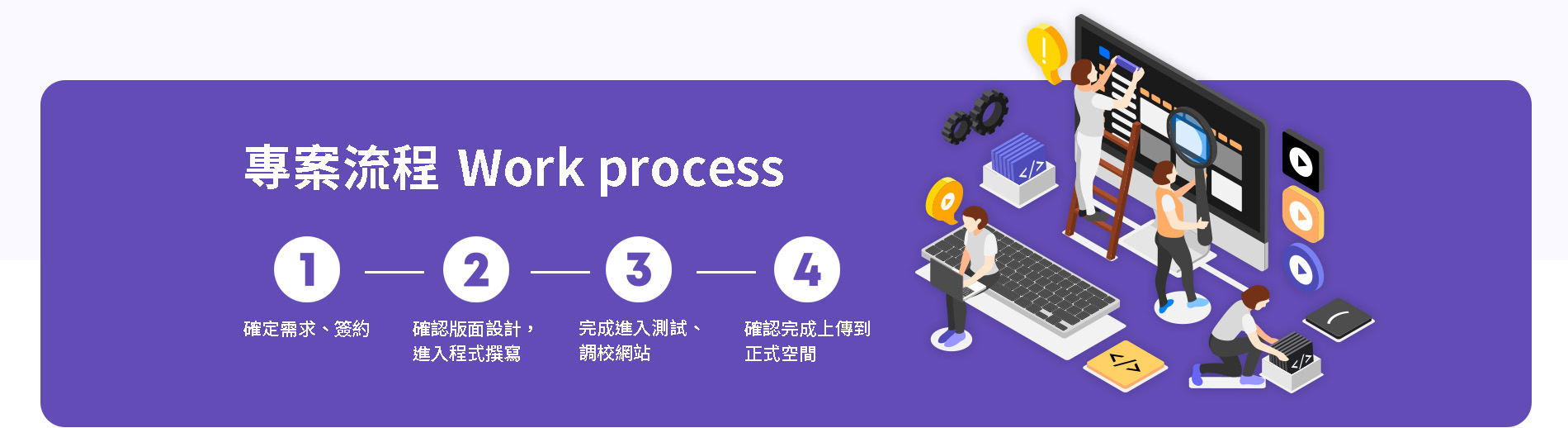 我們成於民國100年,專為企業提供網站架設、程式建置、網路行銷等服務。致力為各大企業提供互連網相關資訊解決方案;並集結各領域的專業團隊,為企業打造多元化的加值服務。